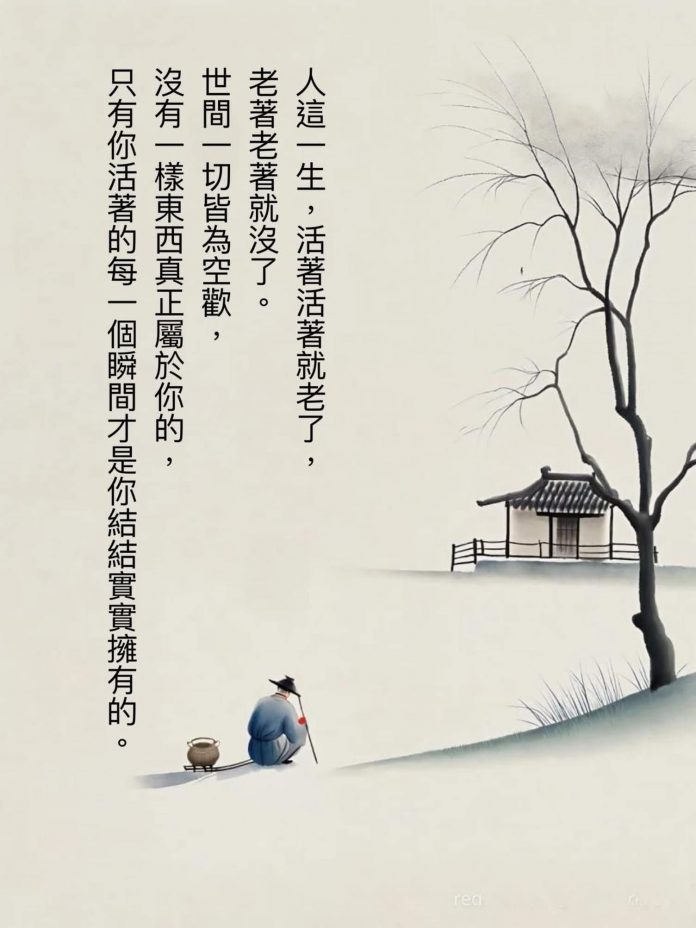 人這一生,活著活著就老了,老著老著就沒了。世間一切皆為空歡,沒有一樣東西真正屬於你的,只有你活著的每一個瞬間才是你結結實實擁有的。