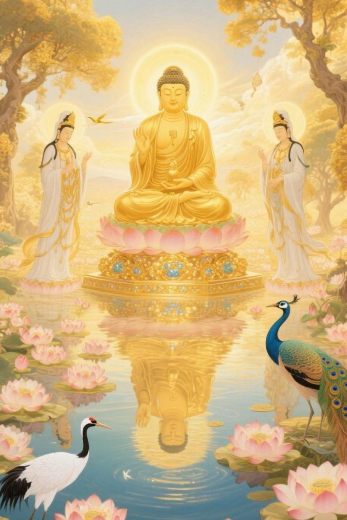 因此,如果發願往生極樂世界,臨命終時,便會見到阿彌陀佛與觀音、大勢至等諸聖眾菩薩,一起前來接引往西方淨土。